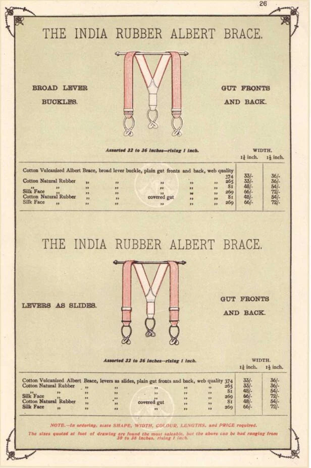 Albert Thurston created his eponymous brand in the early 19th century as a tailor and a fine accessory maker. He introduced the first braces in 1820, and his name was thereafter intertwined with this product and the quality of it in particular. Albert Thurston received an Honorable Mention for the excellent standard of their products at the Great Exhibition in Hyde Park, London in 1851. They've remained true to that standard, updating their designs only to take advantage of "new" technologies like metal adjusters that lay flatter and elastic to take stress off of your brace buttons.